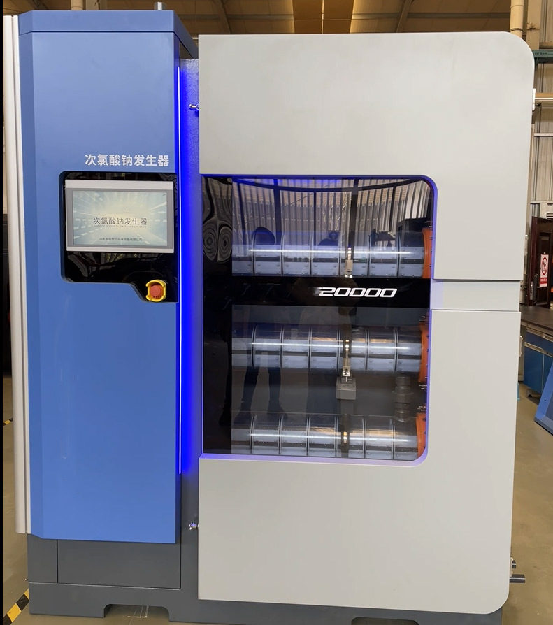เครื่องกำเนิดโซเดียมไฮโปคลอไรต์หรือที่เรียกว่าตู้ฆ่าเชื้อโซเดียมไฮโปคลอไรต์หรืออุปกรณ์ฆ่าเชื้อเครื่องกำเนิดโซเดียมไฮโปคลอไรต์ หลักการทำงานคือการผสมน้ำเกลือให้มีความเข้มข้น 3-5% แล้วส่งไปยังถังอิเล็กโทรลิซิสโดยปริมาตรผ่านปั๊มสูบจ่าย ถังอิเล็กโทรไลซิสไทเทเนียมอิเล็กโทรไลต์ถูกไฟฟ้าและอิเล็กโทรไลต์เพื่อผลิตสารฆ่าเชื้อโซเดียมไฮโปคลอไรต์ที่ขั้วบวก ซึ่งจะถูกเก็บไว้ชั่วคราวในกล่องเก็บโซเดียมไฮโปคลอไรต์ แคโทดจะก่อให้เกิดก๊าซไฮโดรเจนและถูกปล่อยออกมากลางแจ้ง สารฆ่าเชื้อโซเดียมไฮโปคลอไรต์จะถูกเติมลงในจุดจ่ายอย่างแม่นยำผ่านปั๊มสูบจ่าย เพื่อให้เกิดการฆ่าเชื้อ การฆ่าเชื้อ ออกซิเดชัน และการเปลี่ยนทดแทน ระบบประกอบด้วยอุปกรณ์น้ำอ่อนตัวล่วงหน้า ซึ่งมีจุดมุ่งหมายเพื่อทำให้คุณภาพน้ำอ่อนลง ลดความกระด้าง ป้องกันตะกรัน และลดความล้มเหลวของอุปกรณ์ อุปกรณ์ที่มีน้ำหนัก 800 กรัม/ชม. ขึ้นไปจะติดตั้งอิเล็กโทรดหลายชุด ทั้งระบบประกอบด้วยส่วนปรับสภาพแหล่งน้ำ ส่วนละลายเกลือ ส่วนเภสัชกรรม และส่วนจ่ายสาร ตัวอุปกรณ์มีการป้องกันระดับต่ำและการป้องกันอุณหภูมิสูง ประสิทธิภาพที่มั่นคง ปลอดภัย และเชื่อถือได้ ใช้งานง่าย